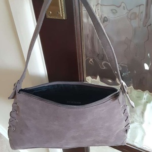 River Island soft mauve suede leather handbag with thonging detail, preowned.