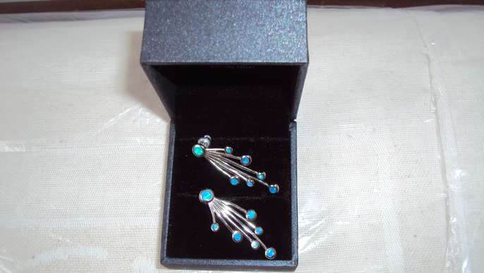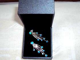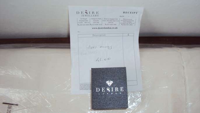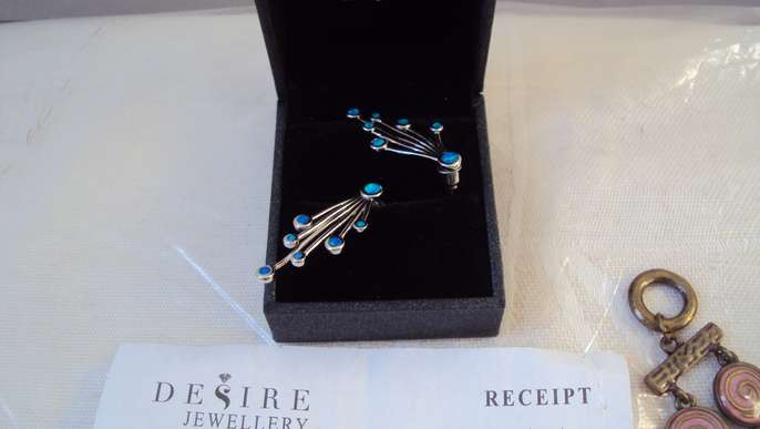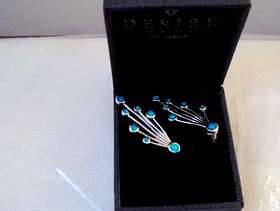 Beautiful stud earrings in silver with 7 blue stones in each ear ring, opaline, bought on sale last year for £45 (I have the receipt) and selling for £20. By Desire and in a Desire box. Not worn. Collect in London NW11 halfway between Golders Green and Finchley Central tube stations, buses a 3 min walk on Finchley Road or 5 mins on North Circular (nearest bus stop post code is NW11 6AG). Free to park outside.