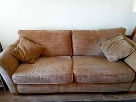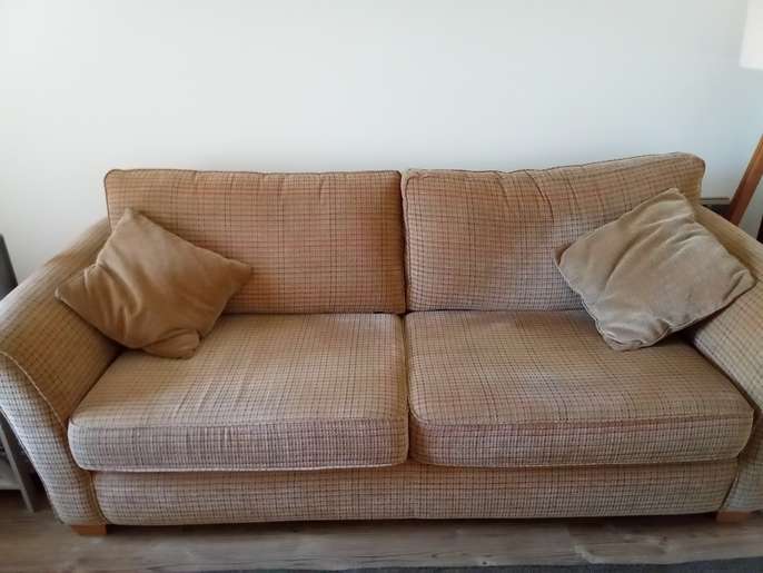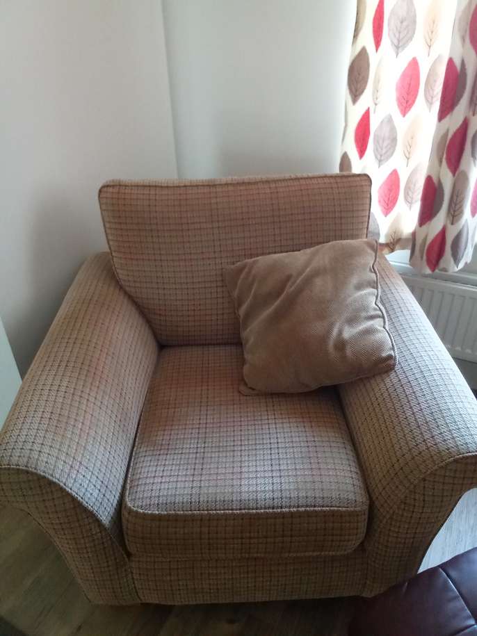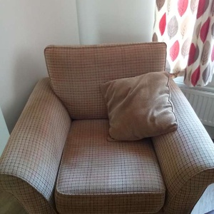Lovely comfy sofa and armchair with seat cushions that have been replaced so in very good condition.