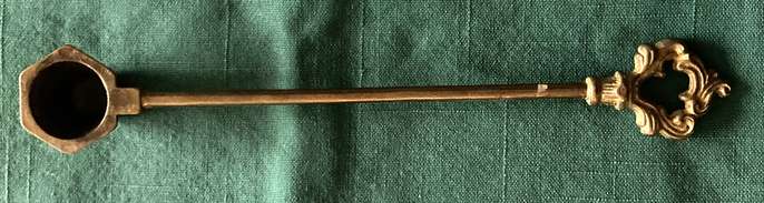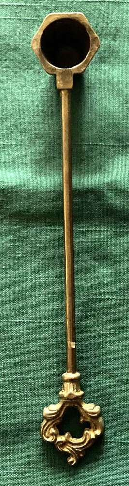 Elegant vintage candle snuffer featuring a decorative handle and a rare hexagonal bell-shaped extinguisher. Crafted from brass-toned metal with intricate detailing, this piece measures approximately 8 inches (20 cm) in length. Gently used with age-appropriate patina.