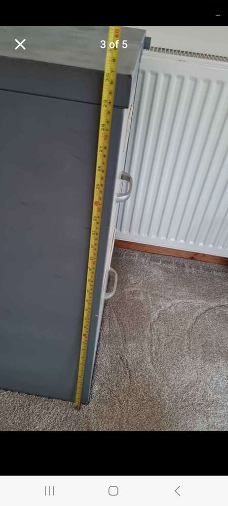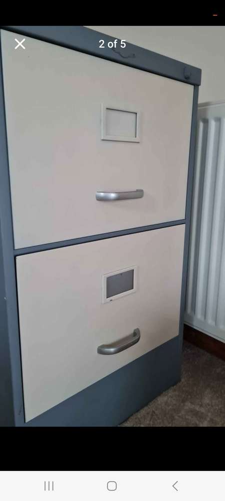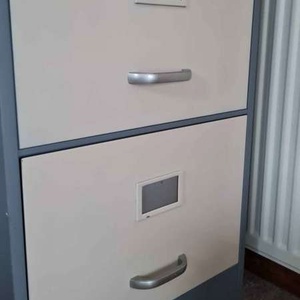 Takes foolscap size hanging files Has a lock but I don't have the keys Has been spray painted cream and grey