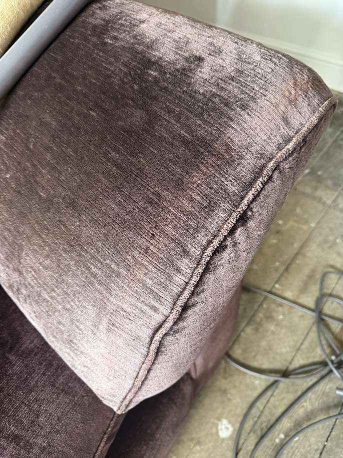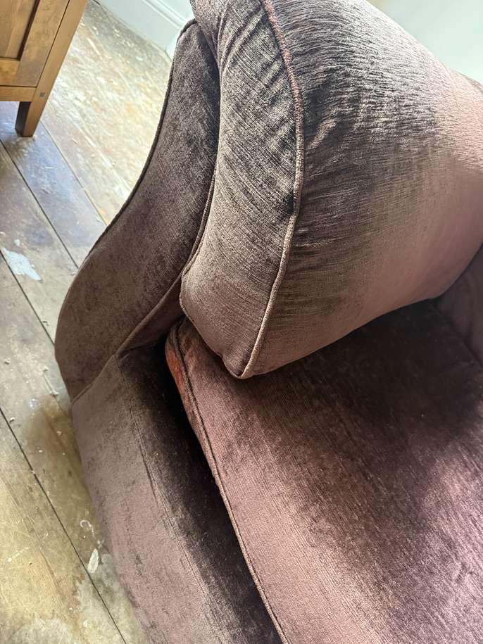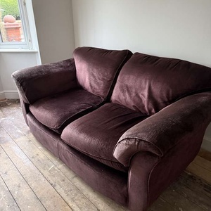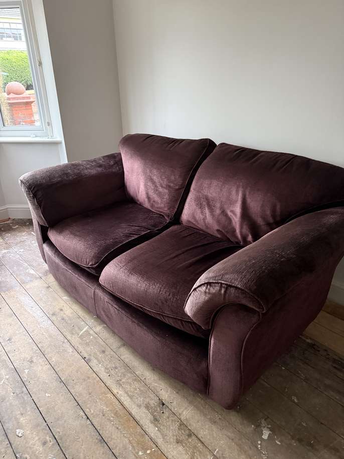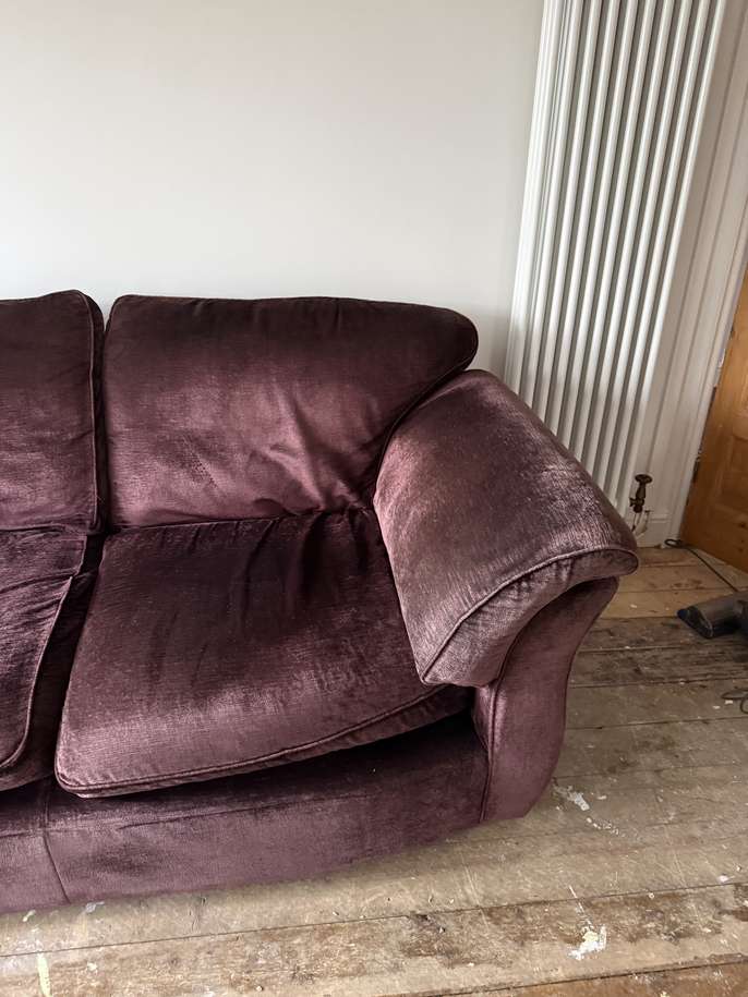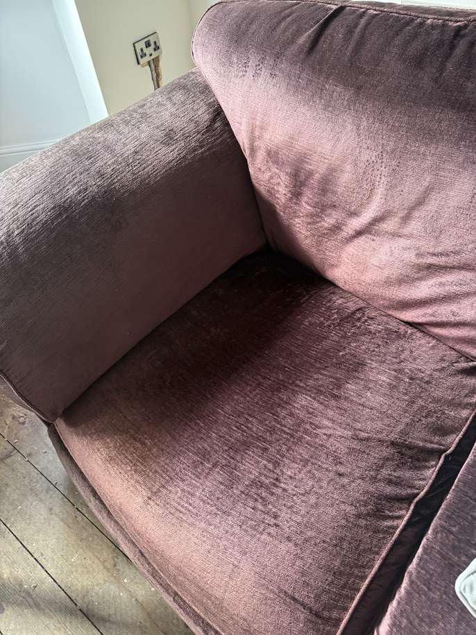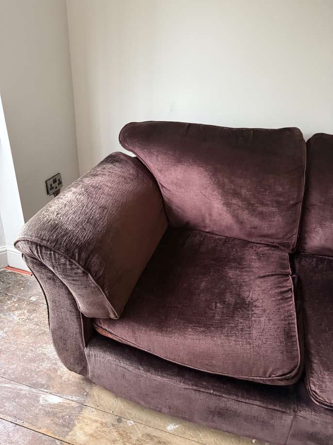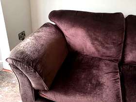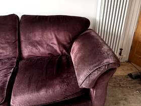 Marks and Spencer 3 piece velour suite. Plum colour. No rips or tears. Fire label. Some fading under and on the arms but very comfy.