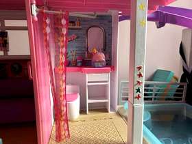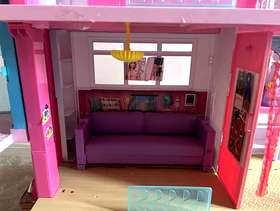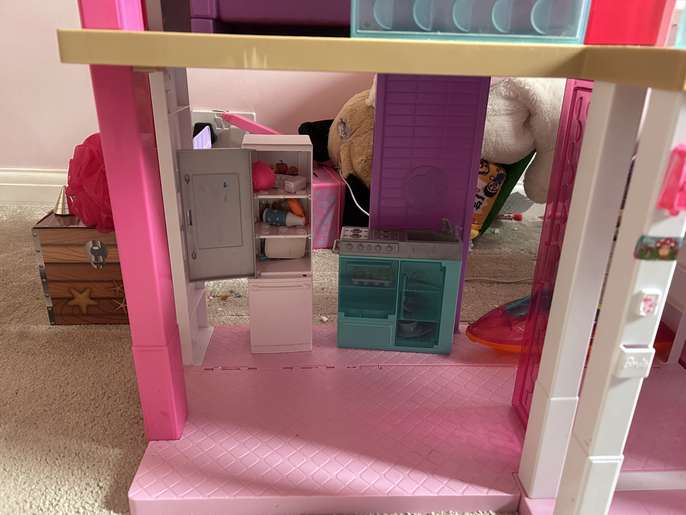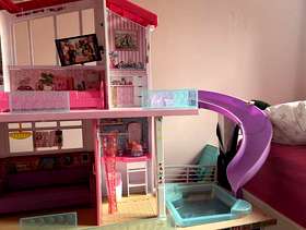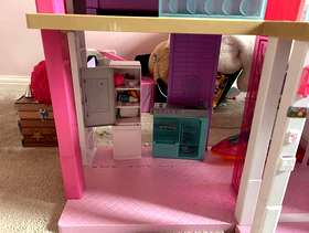 Roughly 5 years old, some wear and tear. The ladder attached to garage is broken. Would require large boot/vehicle to transport as will need to be transported as seen Comes with Barbie car, jet ski, some kitchen equipment and bathroom accessories, 2 x beds