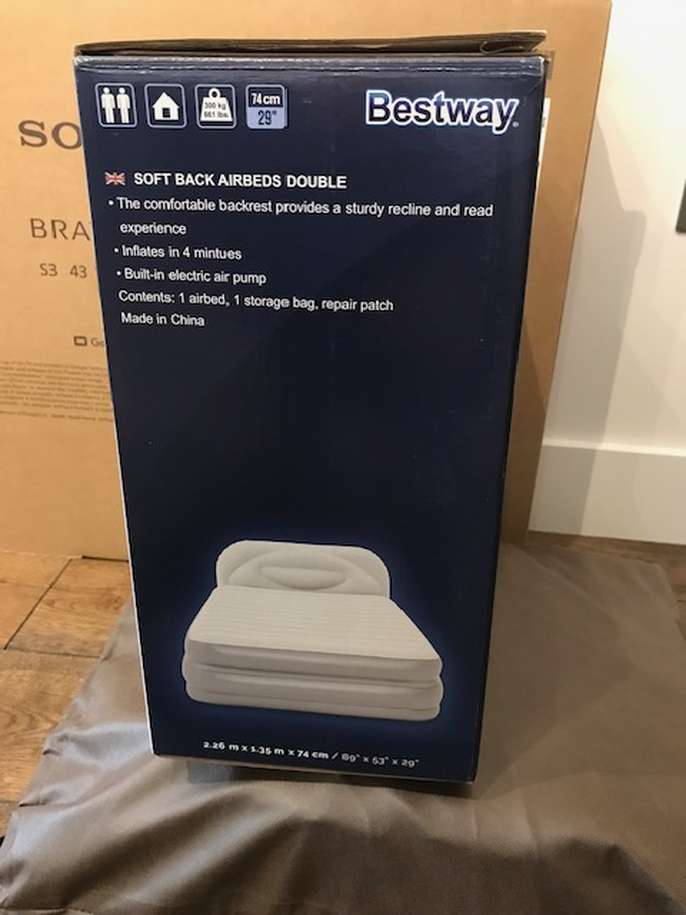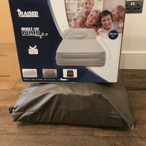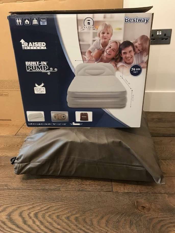 Used condition double airbed with a built-in electric pump. £85 new. Bought for temporary use end of last year but no longer needed. Worked fine when last inflated. Now in a carry case and box provided. Can no longer fit it back in box, now it is deflated. Heavy to carry. Need transport to collect. Collection only from CT14 this Sunday or Monday. This is the on-line description. Size (LxWxH): 45.0 x 20.0 x 40.0 cm. PVC mattress. Inflates in 300 seconds, deflates in 300 seconds. Built-in electric pump (included). Airtight system. Double lock valve. Repair kit. Carry bag. Double height bed. Size H47, L226, W135cm. Maximum user weight 300kg.