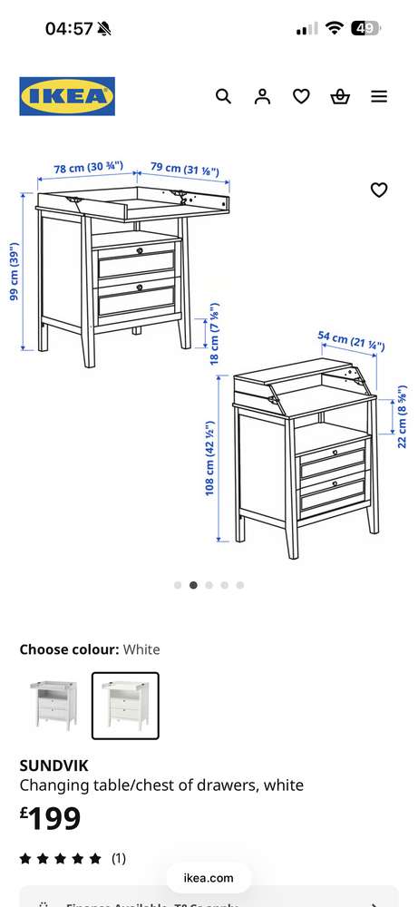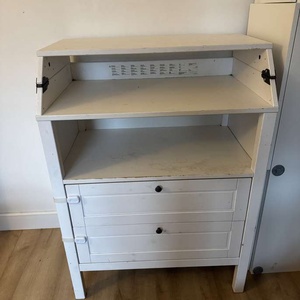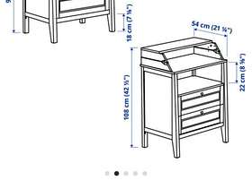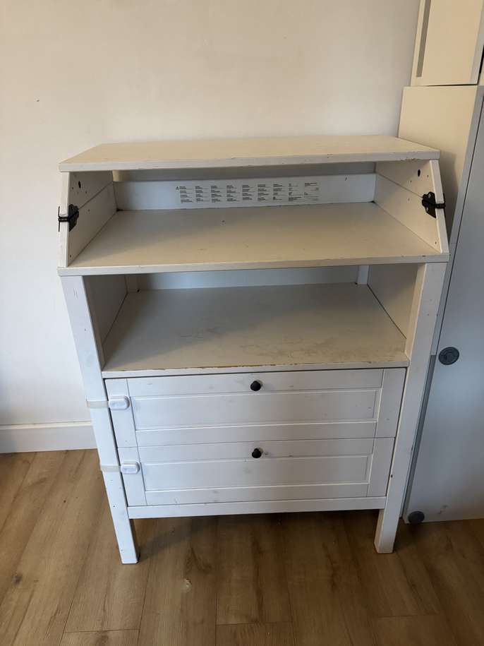 No longer needed. Top opens up into changing table, has two drawers good for storing nappies, wipes and other baby items for easy access.