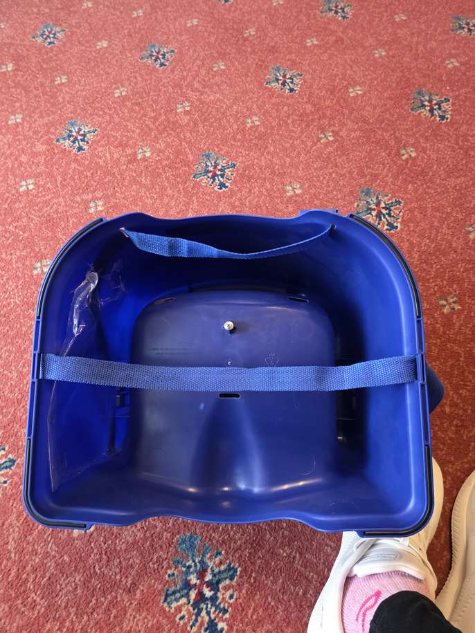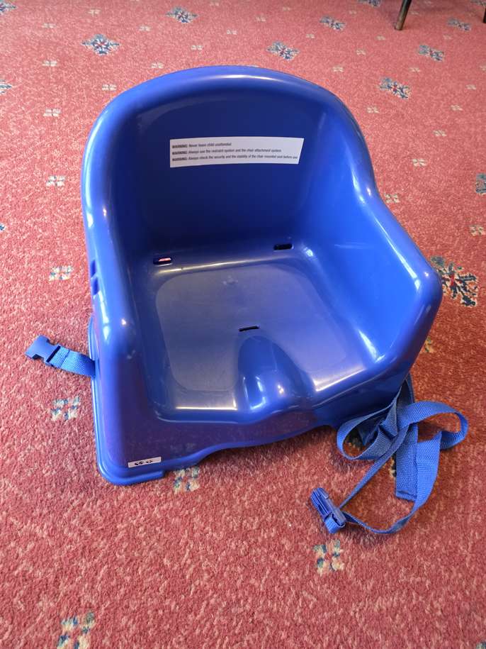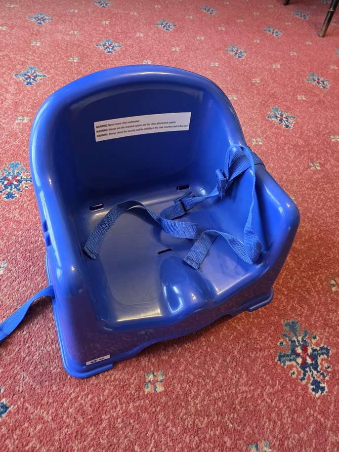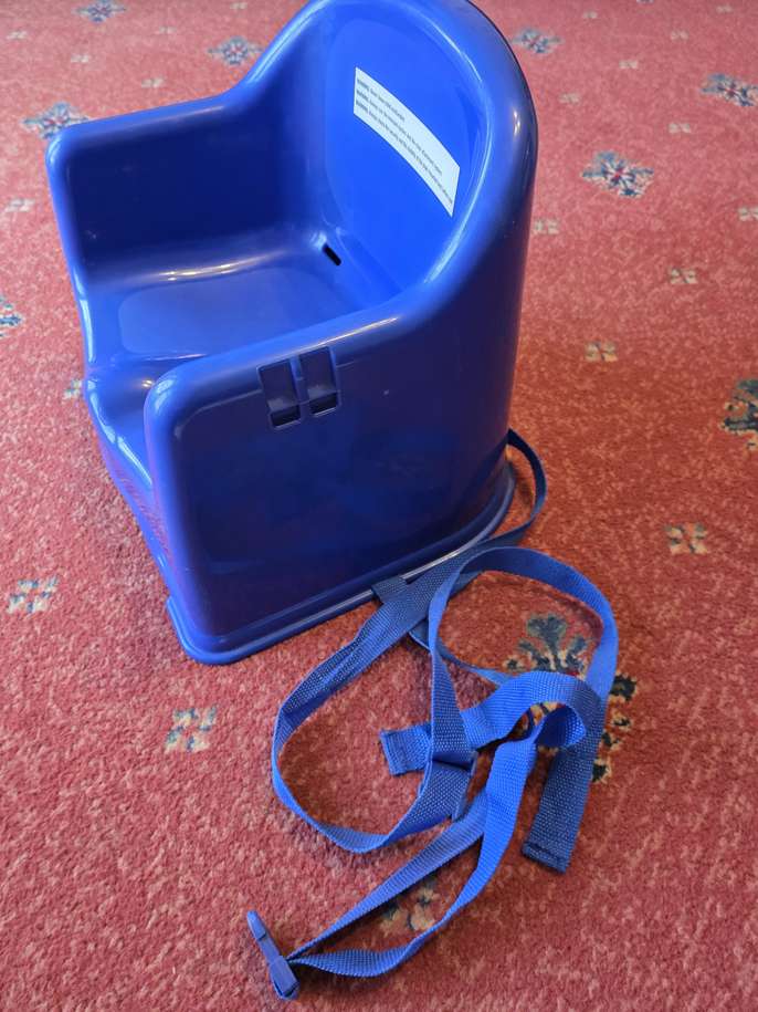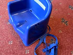 Extension to a chair for kiddies to sit at a table. Straps attached to secure it to a dining chair