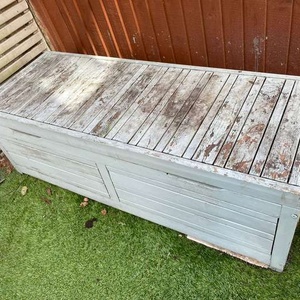 Wooden garden storage box. Needs repainting and the base has collapsed, so it needs a bit of work. Could also be turned into a raised planter.