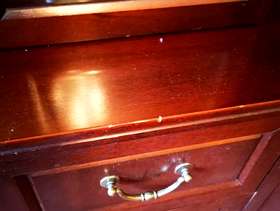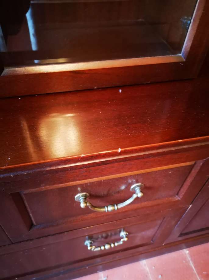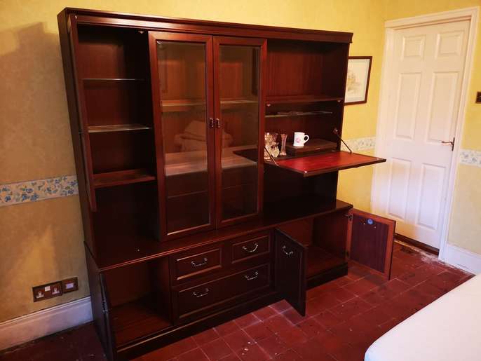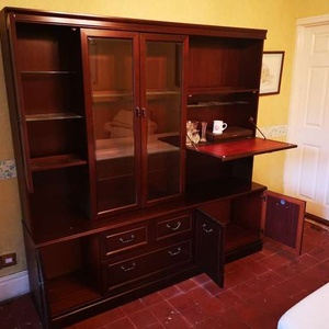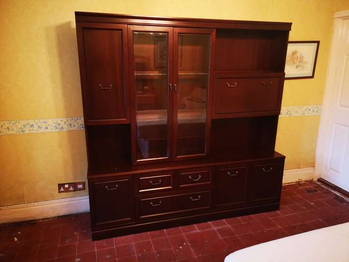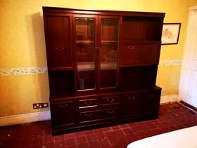 Very good quality mahogany wall unit with great storage- drawers/cupboards/bureau/glass fronted cabinet. Very large (can provide exact measurements if interested) but dismantles into two sections to transport.
