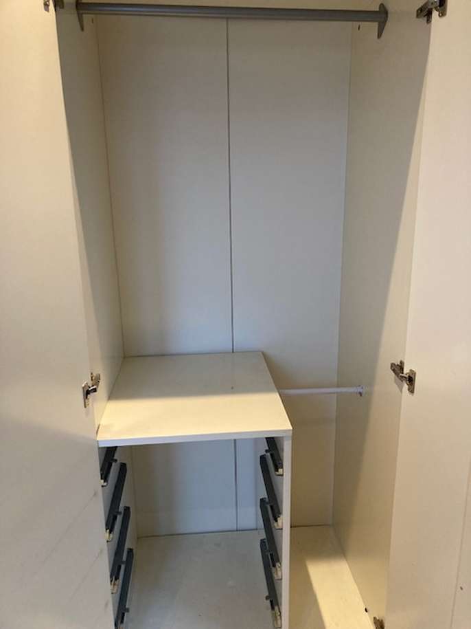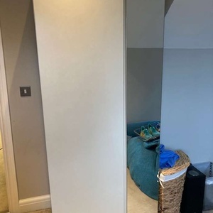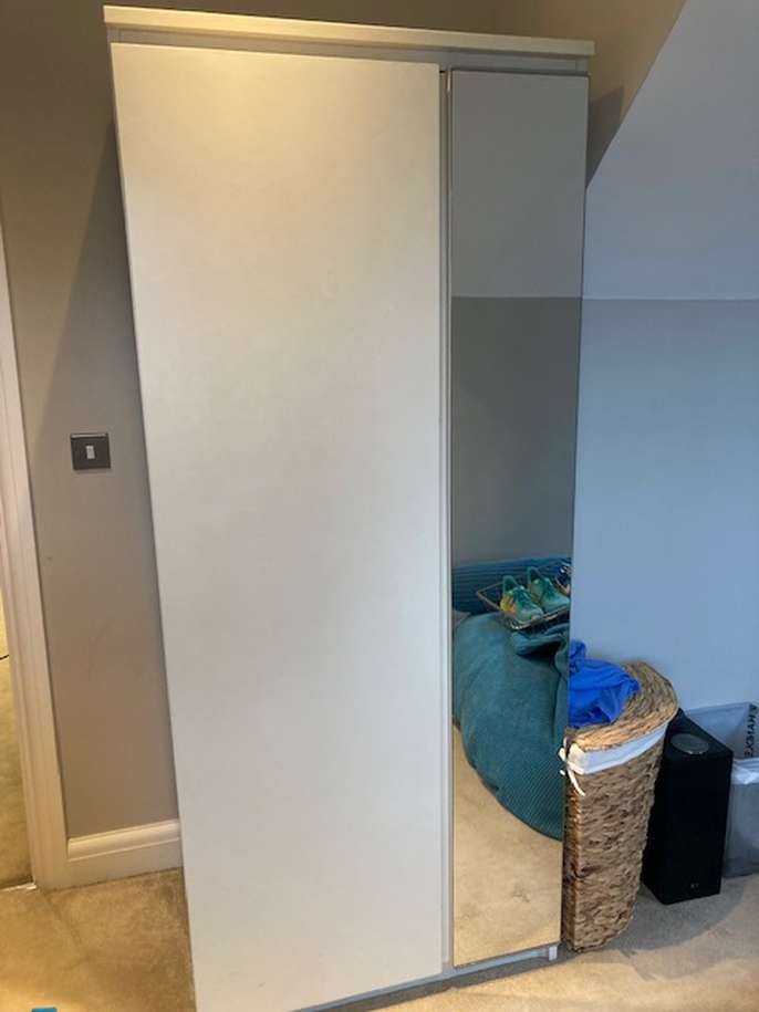 Large wardrobe with mirror 58cm Deep x 190cm High x 80cm Wide. Has been dismantled and labelled up Has slight black mark on left hand side panel where when house aerial got struck by lightning and tv aerial cable was running alongside the side panel