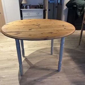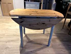 Round dining table that will fold away Pine top and Painted legs Diameter 105cm Height 73cm Width folded 60cm Happy to send more photos