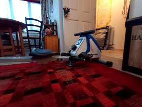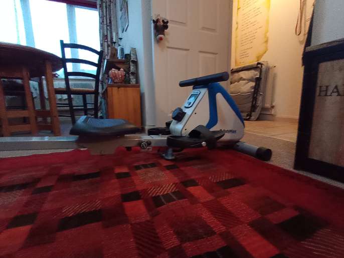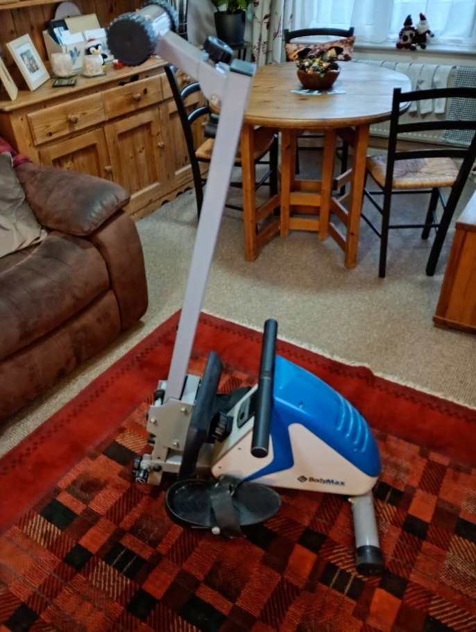 Bodymax R60 Rowing Machine. Excellent condition . Seat runner folds upright for storage. Operating mode Length 185cm,Height 45cm ,Width 80cm. Folded upright Height 125cm,width 52cm,Depth80cm.
