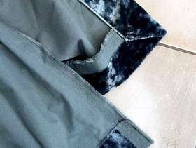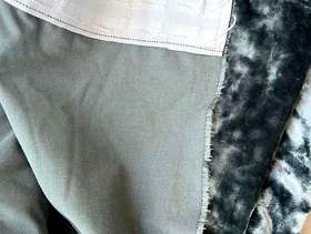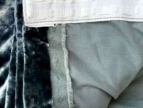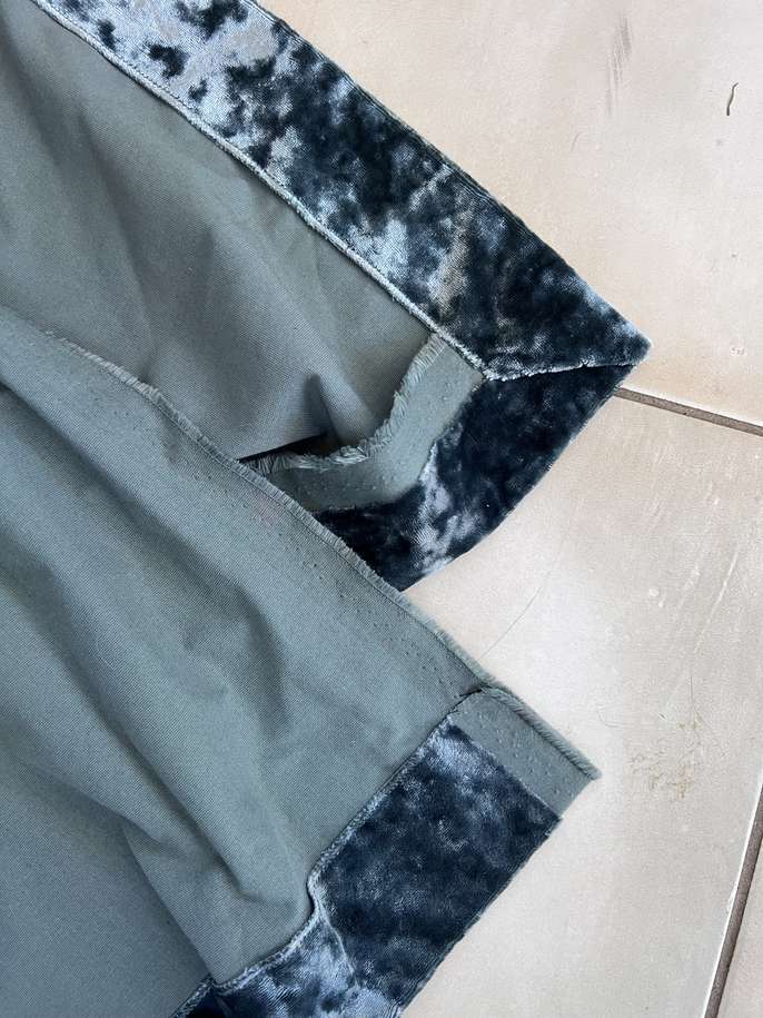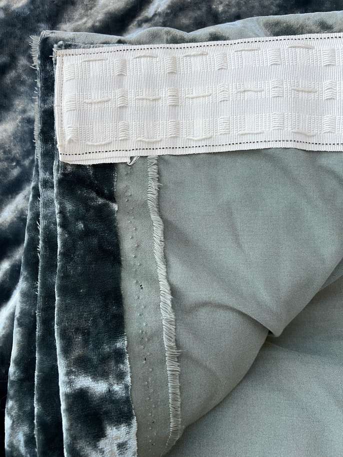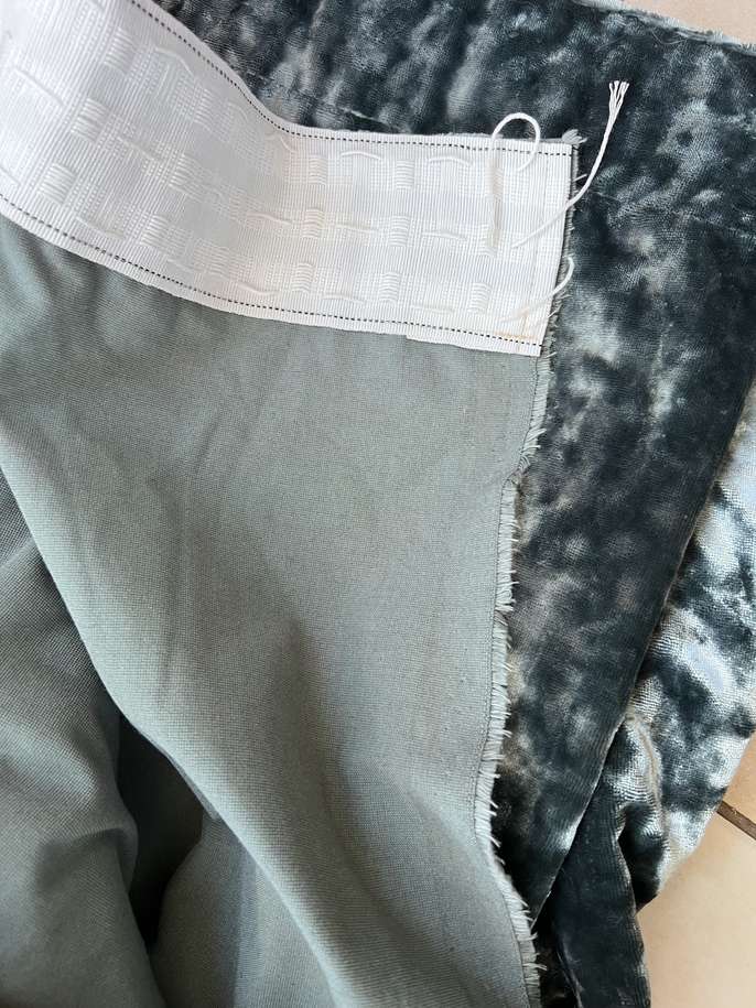 A single curtain which is unlined. A beautiful teal coloured velvet. There is a join in the middle to make the width 270cm wide and the length is 219cm. One side is turned in to form a hem down the side with a mitred corner at the bottom hem, and one side is unfinished with just the self edge. You can see this in the photos. This would work well across a door or the fabric can be repurposed. Collection only.