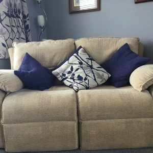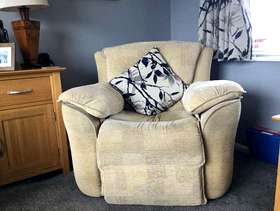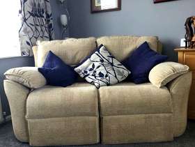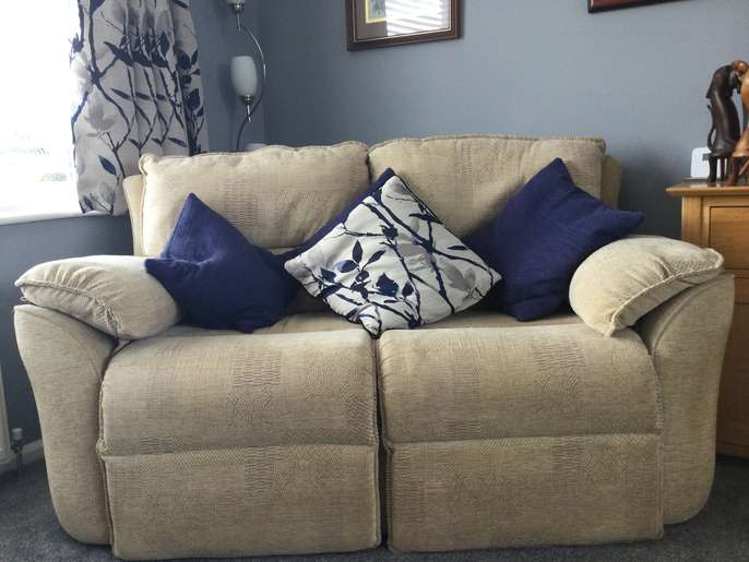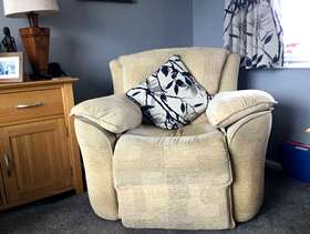 Free for collection A comfortable three piece suite Two seater settee Two chairs ( one a recliner which no longer works) Colour cream Washable covers In very good condition