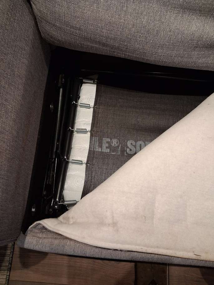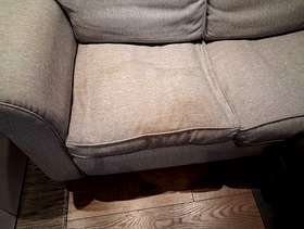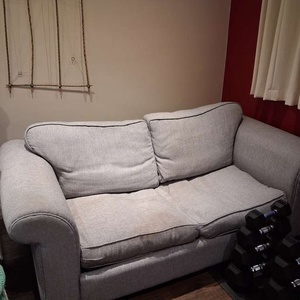 A two seater, grey, sofa bed ( weights not included 😉 ) Easy to pull out mecahnism with thin mattress included - for occasional use. It is in reasonable condition but has a stain on one of the cushions (see photo). This couldn't be fully removed despite cleaning (it is due to a red wine spill). Pull out bed frame will have to be disconnected from frame in order to remove. You will need a small van of some sort.